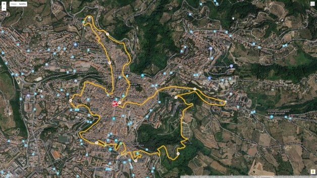 Il percorso attraversa tutta la città con parte nella campagna circostante. Molto affascinante soprattutto il passaggio nei sotterranei della Rocca Paolina e la salita in notturna al Tempio di S. Angelo.